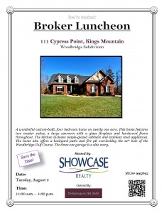 Showcase Realty is hosting a free broker luncheon from 11:30 a.m.-1:30 p.m. on August 2, at 111 Cypress Point in Kings Mountain, North Carolina. Dressing on the Side will be catering the event, and those who attend will have the opportunity to walk through a beautiful home overlooking the Woodbridge Golf Club. Click on the flyer …
